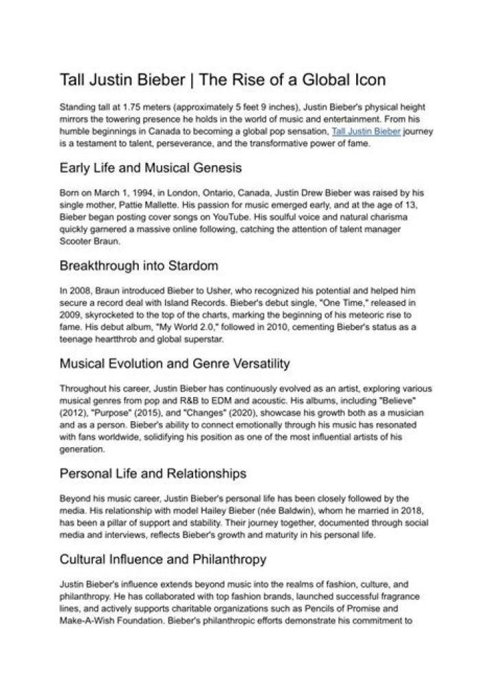 Justin Bieber, one of the most celebrated pop stars worldwide, has captivated audiences with his music and charisma since his debut in 2008. Born on March 1, 1994, in London, Ontario, Canada, Bieber's journey from a young talent discovered on YouTube to a global superstar is nothing short of inspiring. His music has resonated with millions, making him one of the best-selling music artists of all time.