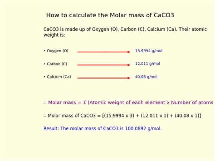 The molar mass of a substance is the mass of one mole of that substance, expressed in grams per mole (g/mol). It is derived from the atomic masses of the elements that make up the compound. For calcium carbonate (CaCO3), the molar mass is crucial in understanding its chemical and physical properties.